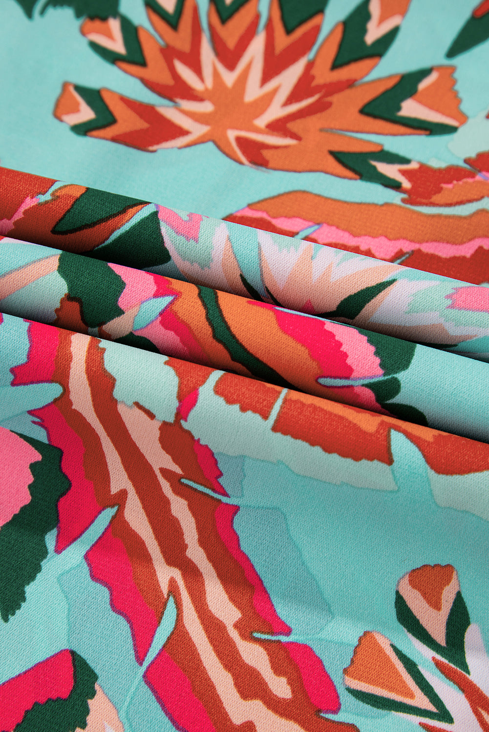 - This maxi dress features a captivating hue adorned with an abstract print.