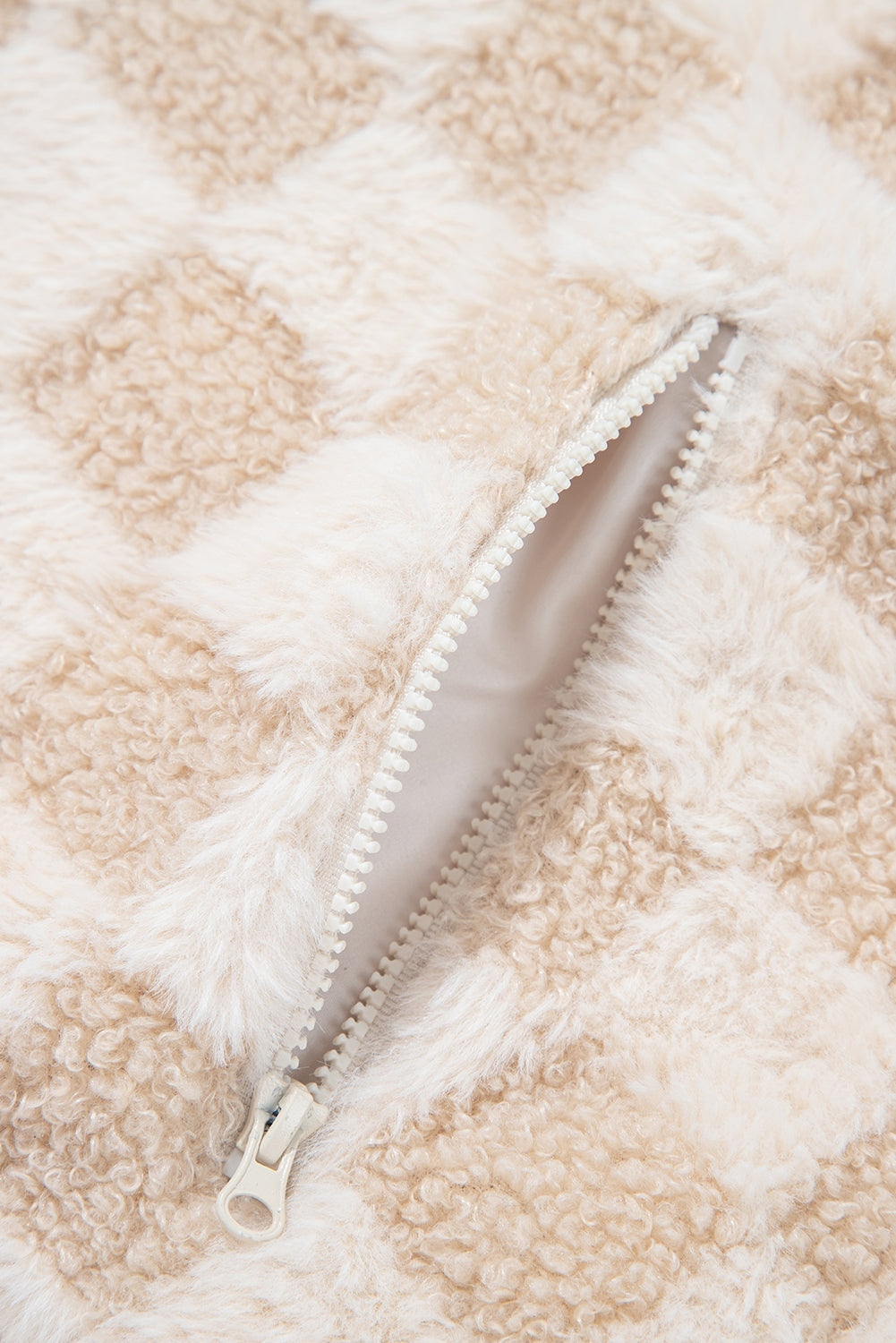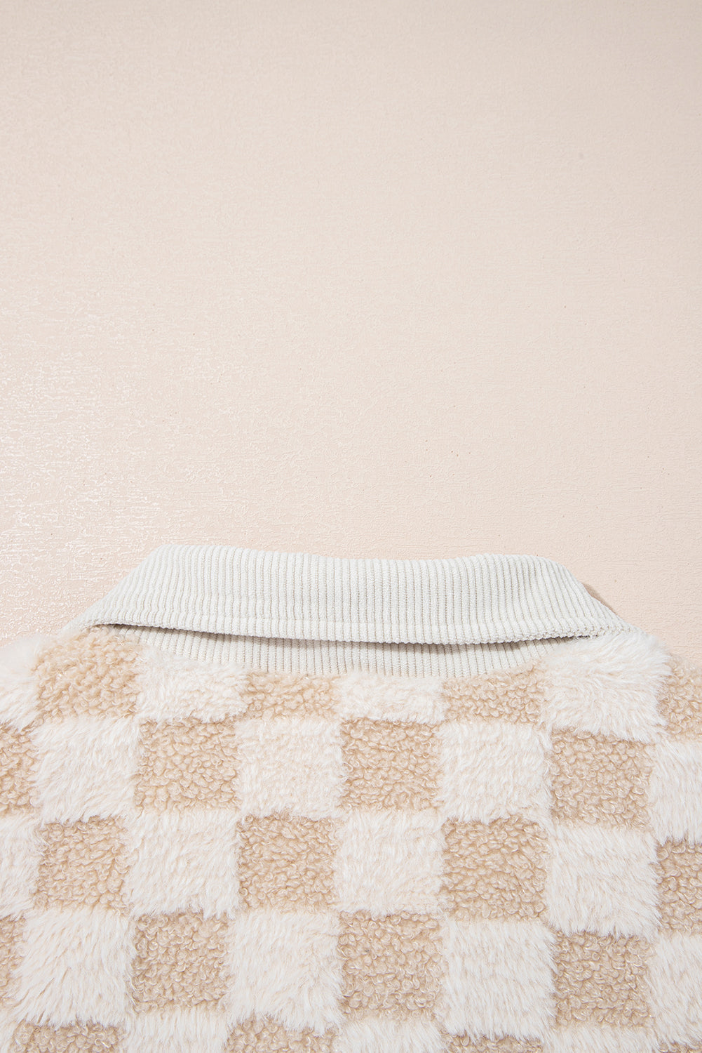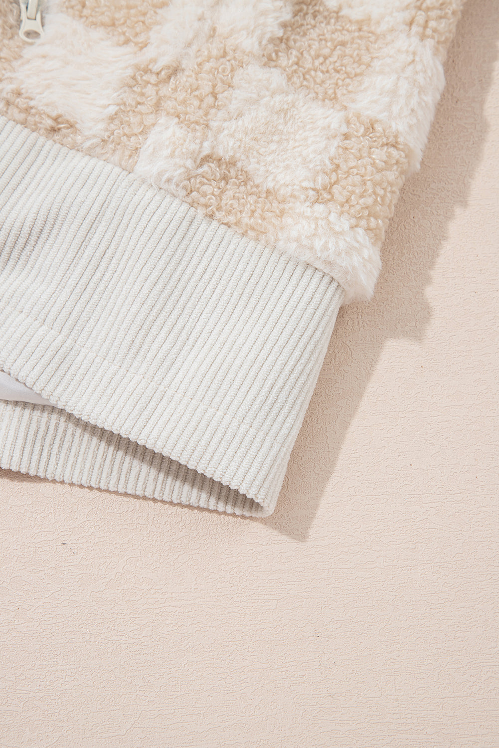 Khaki Checker Sherpa Corduroy Patchwork Zip up Collared Jacket